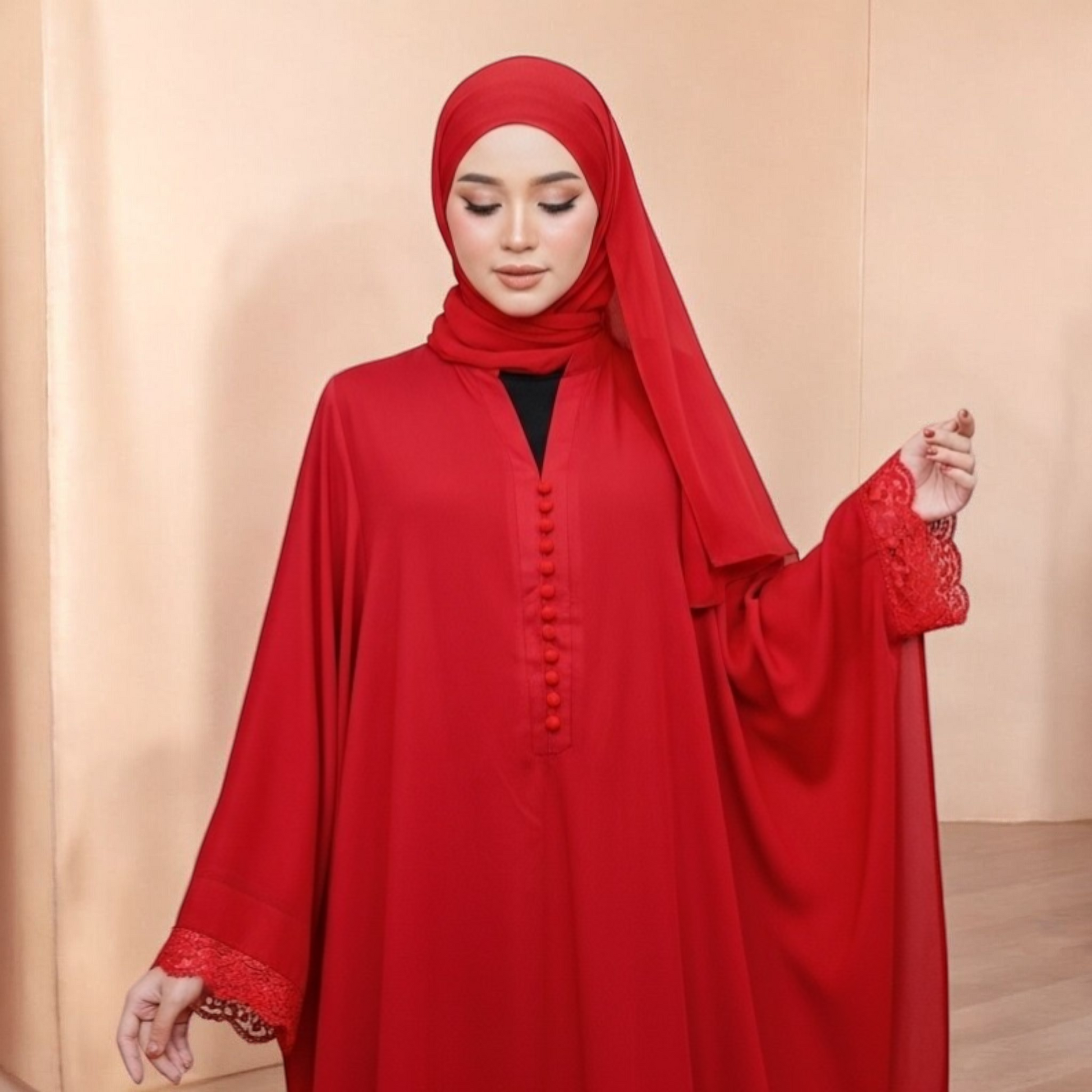 This timeless abaya-style dress is designed with a graceful, flowing silhouette that drapes effortlessly from shoulder to hem. Crafted in a rich deep red tone, the dress offers understated elegance with carefully placed details that elevate its simplicity.